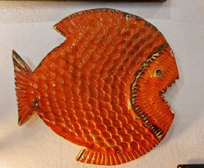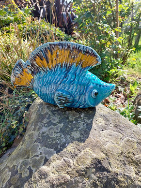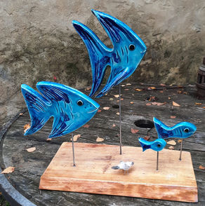 Poissons, hippocampes, en grès ou faïence émaillé, de différentes tailles, posés sur socle acier, ardoise ou bois.